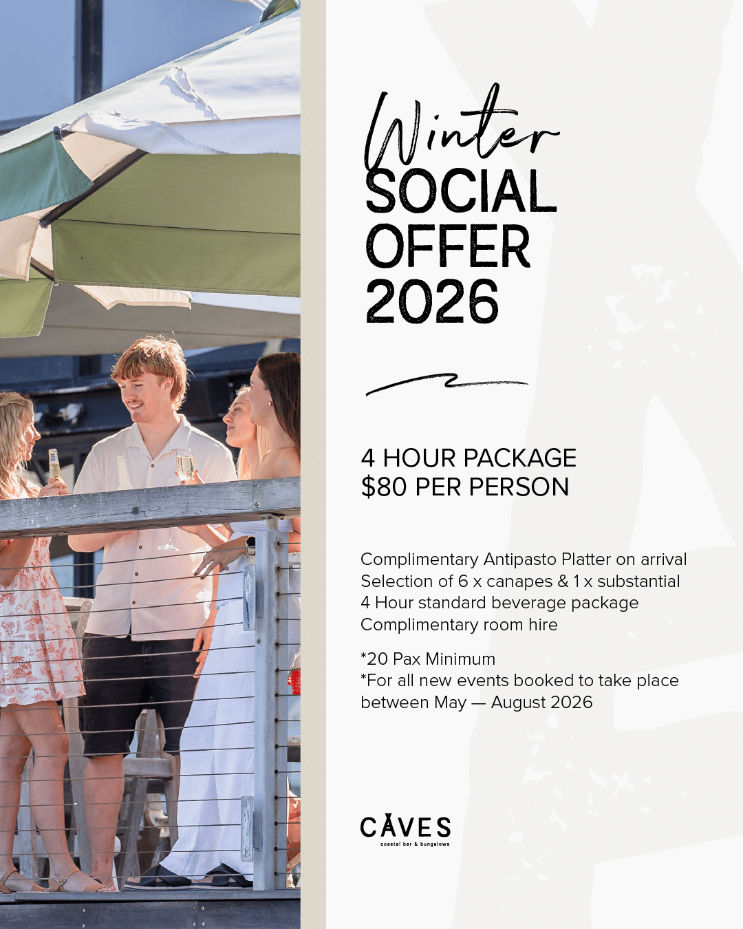 Celebrate life’s big moments and casual meet-ups alike at Caves Coastal. Our spaces are perfect for anything from intimate gatherings to large parties, accommodating from 10 to 250 guests. Birthdays, engagements, bridal showers, or casual get-togethers — whatever the occasion, we’re here to make it memorable with great food and a welcoming setting.